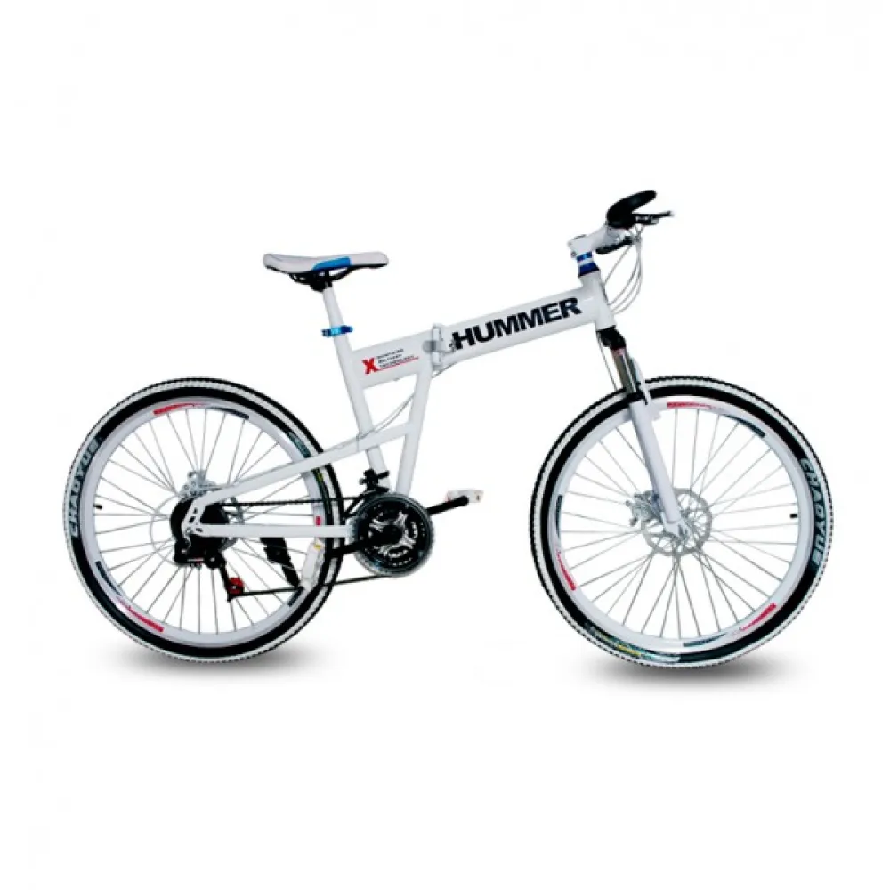 У электровелосипеда HUMMER есть передняя амортизация, повышающая комфортность передвижения. Рама из алюминия складывается, уменьшая габариты вело гибрида вдвое, положить его в багажник автомобиля или убрать на хранение не составит труда.
