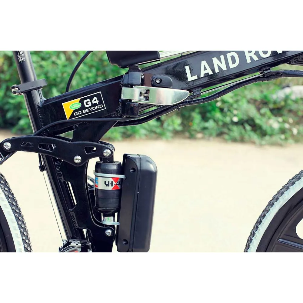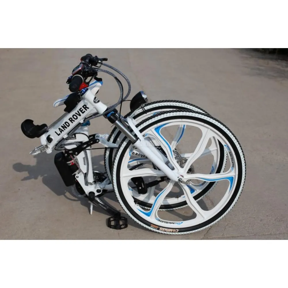 Электровелосипед LandRover имеет амортизацию вилки, тормозная система на два колеса дисковая. Световое освещение и информационную панель. Конструкция рамы достаточно прочная, выполнена из алюминия, складного типа. В сложенном состоянии легко помещается в багажник автомобиля.